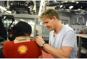 Alle 12.30 Gordon Ramsay ha visitato la cucina del ristorante aziendale il Podio, dedicando un assaggio ai primi del giorno, tra i quali le tagliatelle alla bolognese, particolarmente gradite e definite “delicious”. Sospiro di sollievo, quindi, per gli Chef del Podio che si sono fatti autografare le divise.