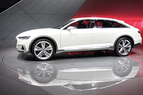 La concept Audi Prologue Avant appare come un’auto elegante e sportiva allo stesso tempo. Spiccano, nel profil, anche i passaruota svasati che accolgono cerchi da 22 pollici a cinque razze.la livrea è realizzata con la tinta bianco porcellana, abbinata a finiture in alluminio. La propulsione si avvale di un motore 4.0 TFSI, un biturbo V8 sovralimentato, un motore elettrico integrato nel cambio tiptronic a otto rapporti , che erogano fino a 734 CV . Con i suoi 14,1 kWh di capacità, la batteria agli ioni di litio, alloggiata nel posteriore, consente di percorrere fino a 54 km in modalità esclusivamente elettrica.